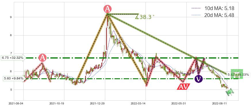 ♘ 阻力价格位5.60,可信任强度64.39%,距离最后交易2022-08-12形成的收盘价格5.10相差 +9.84%