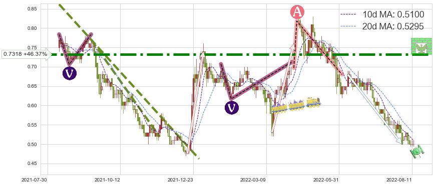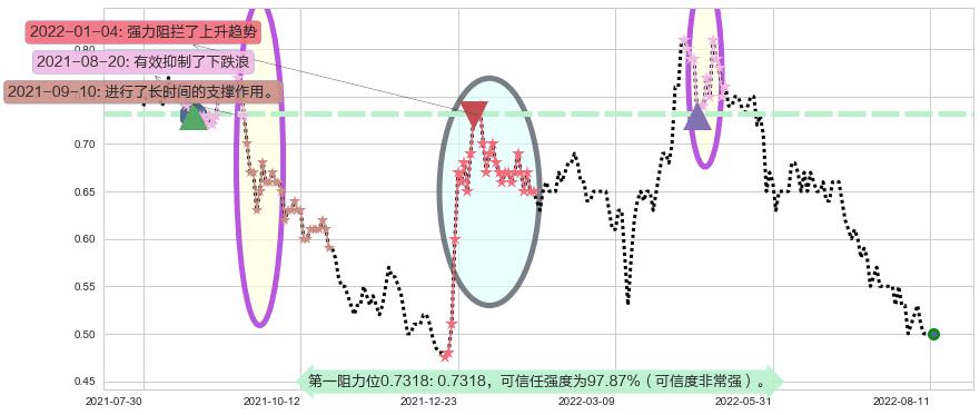♘ 阻力价格位0.7318,可信任强度97.87%,距离最后交易2022-08-12形成的收盘价格0.5000相差 +46.37%