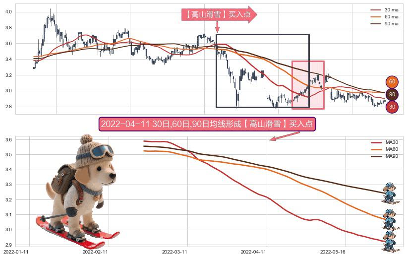 ⚀ 2022-02-24日-2022-05-30日显现 30日-60日-90日均线 【高山滑雪】买入点 看多信号,后市看涨,买入