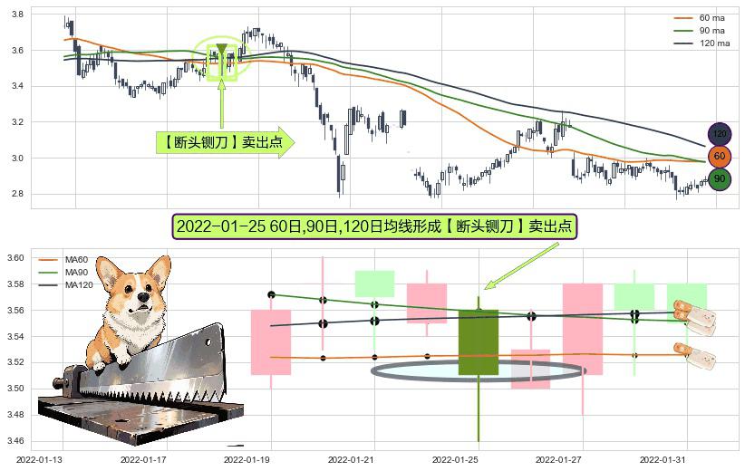 ⚀ 2022-01-25日显现 60日-90日-120日均线 【断头铡刀】卖出点 看空信号,后市看跌,卖出