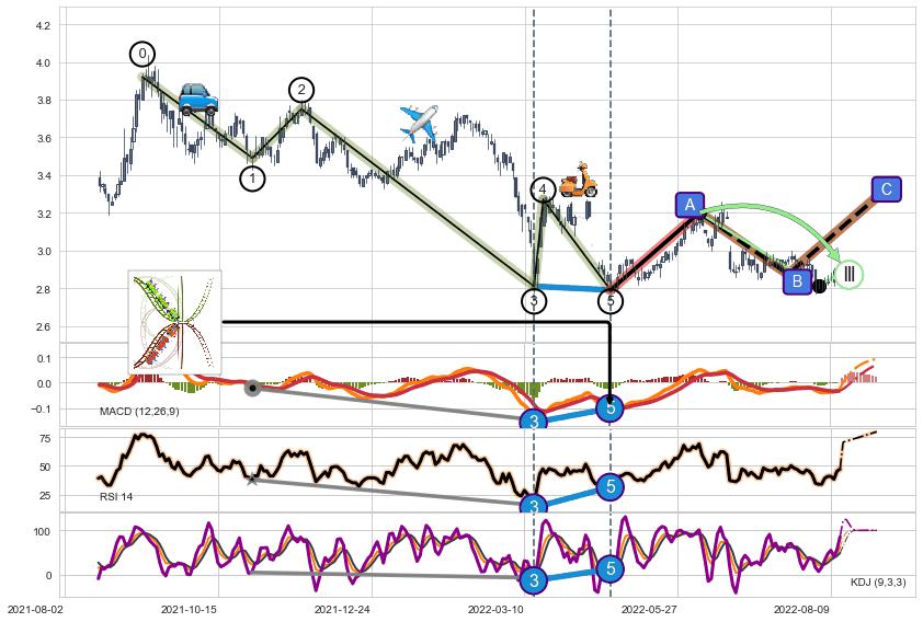 ➢ 1,3,5驱动浪MACD, RSI, KDJ走势都出现【常规背离】反转信号增强