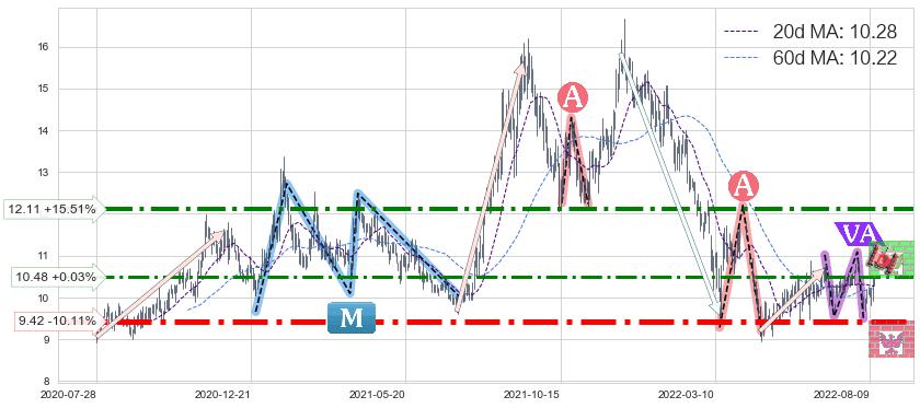 ♘ 支撑价格位9.42,可信任强度95.37%,距离最后交易2022-08-12形成的收盘价格10.48相差 -10.11%