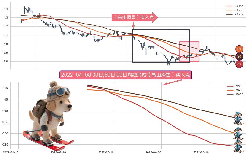 形态多维评估: ⚀ 2022-02-23日-2022-05-31日显现 30日-60日-90日均线 【高山滑雪】买入点 看多信号,后市看涨,买入