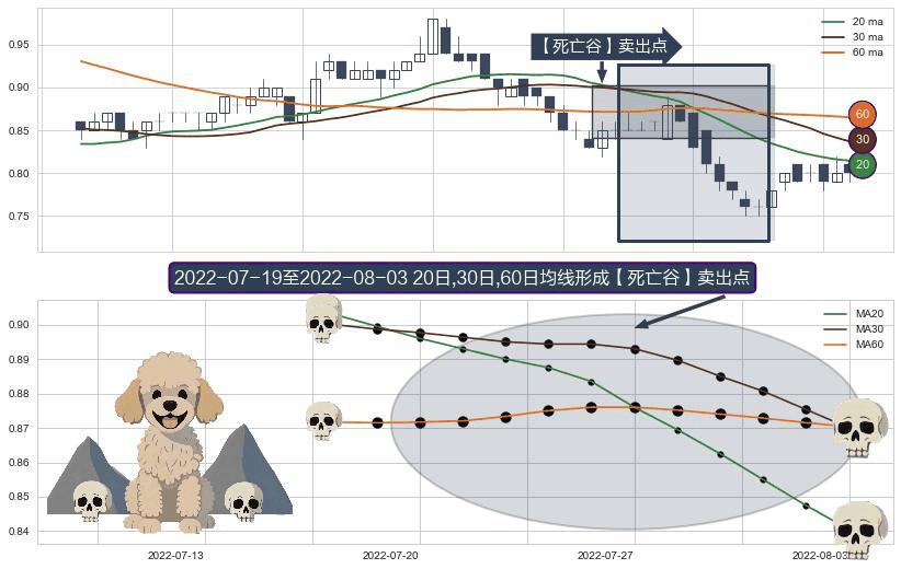 形态多维评估: ⚀ 2022-07-20-日至2022-08-03-日显现 20日-30日-60日均线 【死亡谷】卖出点 看空信号,后市看跌,卖出