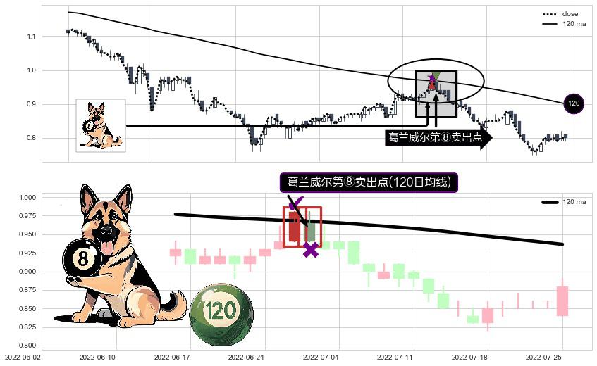 形态多维评估: ⚀ 2022-06-29-日显现 葛兰威尔均线 120日均线 第⑧卖出点 下降趋势的中继信号,后市看跌,卖出信号