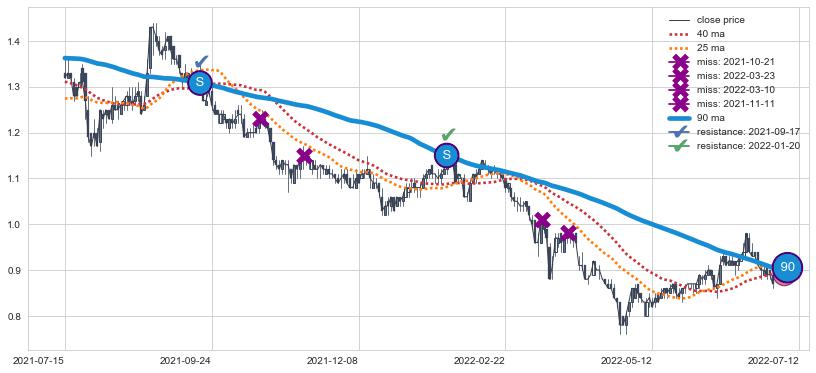 下跌趋势2021-07-15-2022-07-12,均线90确认关键阻力2处