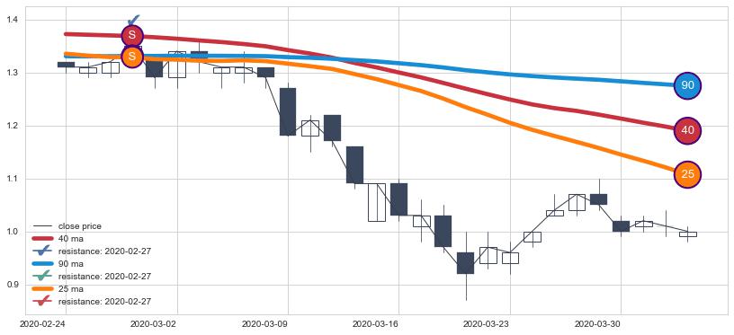 下跌趋势2020-02-24-2020-04-02,均线40, 25, 90确认关键阻力1处