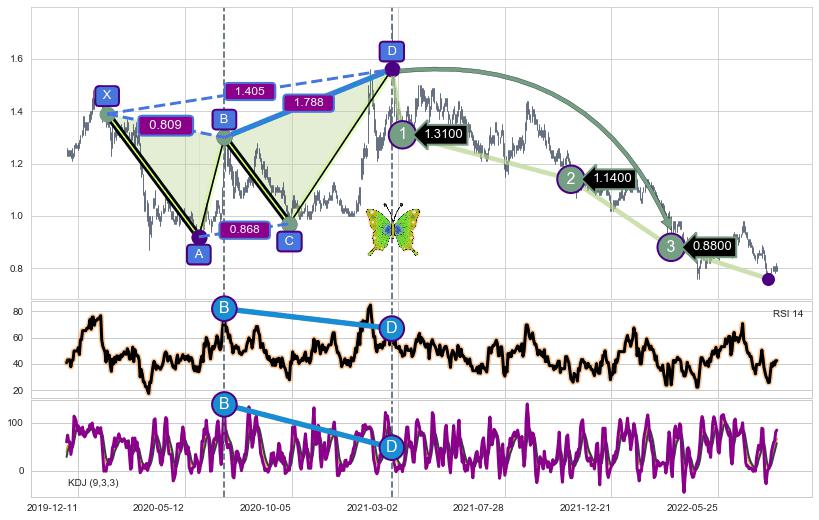 ➣ 已完成【蝴蝶】形态起点X: 2020-01-22, 终点D: 2021-02-22, 共268交易日