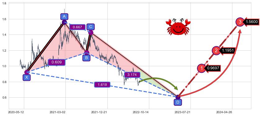 ➢ 距离预测D点位置尚有下跌空间,短线依然【看跌】, 耐心等待看涨【螃蟹】形态反转启动