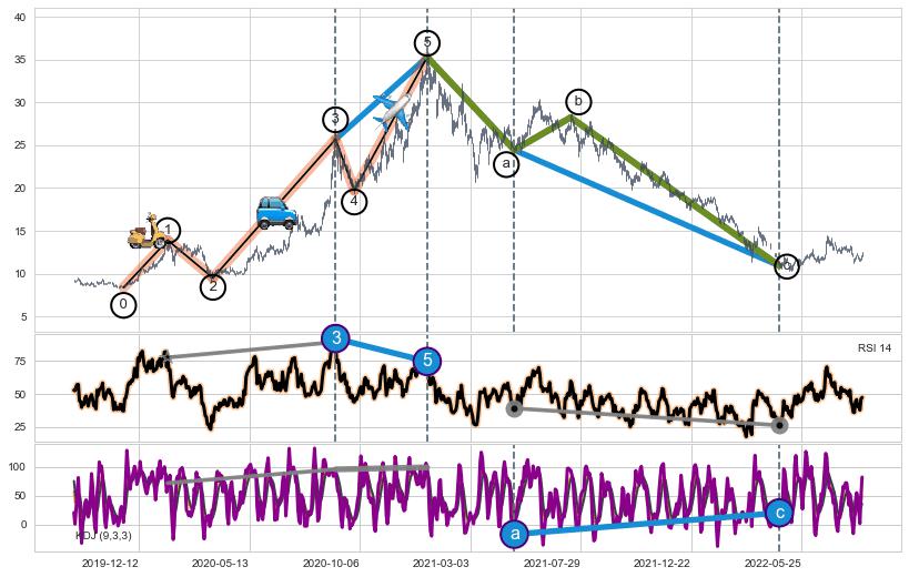 ➣ 1,3,5驱动浪MACD, RSI, KDJ走势都出现【常规背离】反转信号增强