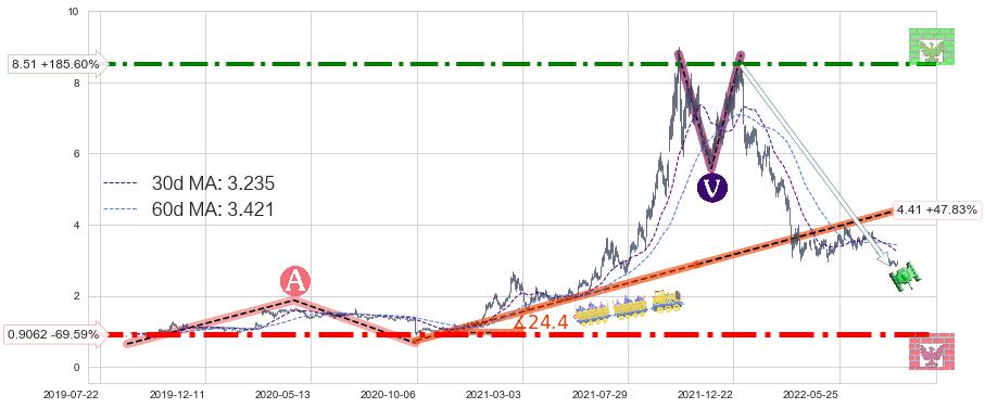 ♘ 阻力价格位8.51,可信任强度75.03%,距离最后交易2022-08-12形成的收盘价格2.980相差 +185.60%