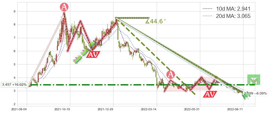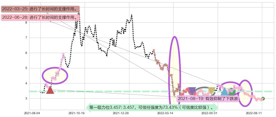 ♘ 阻力价格位3.457,可信任强度73.43%,距离最后交易2022-08-12形成的收盘价格2.980相差 +16.02%