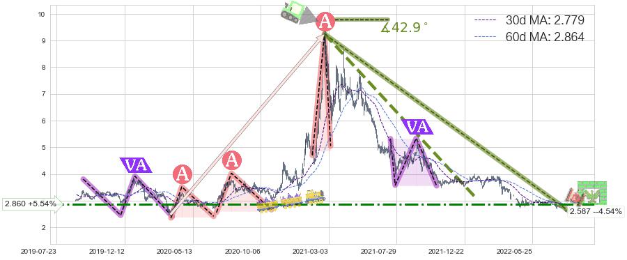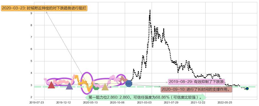 ♘ 阻力价格位2.860,可信任强度68.86%,距离最后交易2022-08-12形成的收盘价格2.710相差 +5.54%