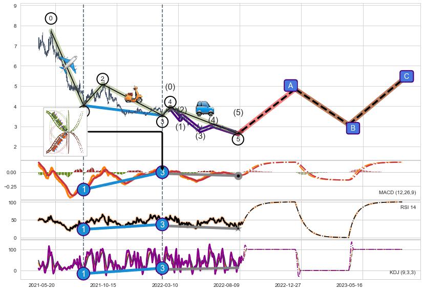 ➢ 1,3,5驱动浪MACD, RSI, KDJ走势都出现【常规背离】反转信号增强