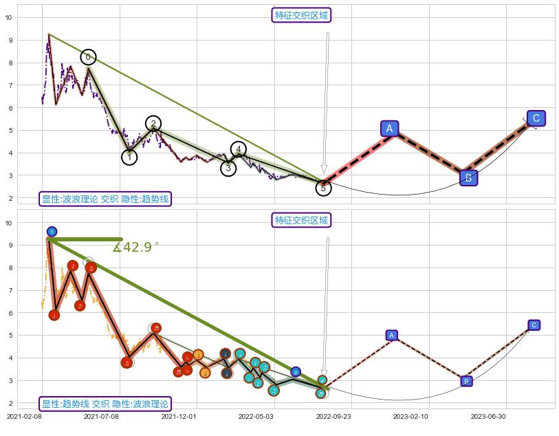 | 6 🅚:底部尽头线(上山虎) ➕ 🌊:波浪理论猜想下跌浪5已形成,猜想后续形成abc反弹上涨(均值回复) ☞ 看多信号 ⇥ 【🅚线】交织【图形】⇥ 综合量化分数: 51 | > |