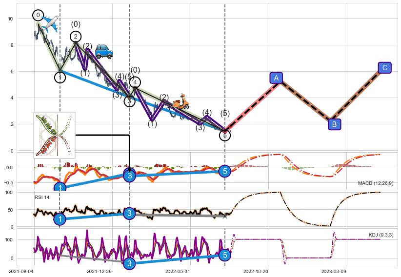 ➢ 1,3,5驱动浪MACD, RSI, KDJ走势都出现【常规背离】反转信号增强