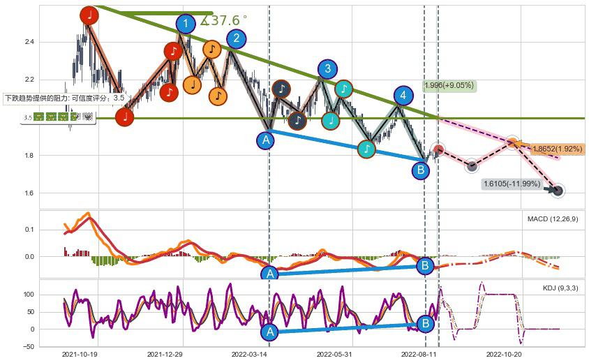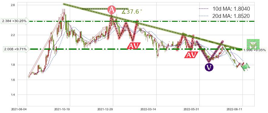 ♘ 在最后的下跌阶段2021-10-06至2022-08-11,存在 持续未破位的阻力位 ,阻力价格1.996,可信任强度80.88%,其距离最后价格1.8300相差 +9.05%