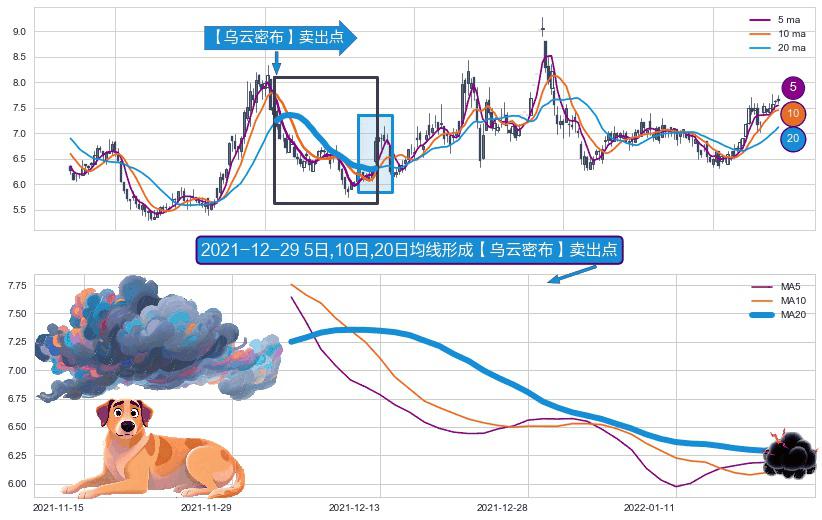 ⚀ 2021-12-03日-2022-01-20日显现 5日-10日-20日均线 【乌云密布】卖出点 看空信号,后市看跌,卖出