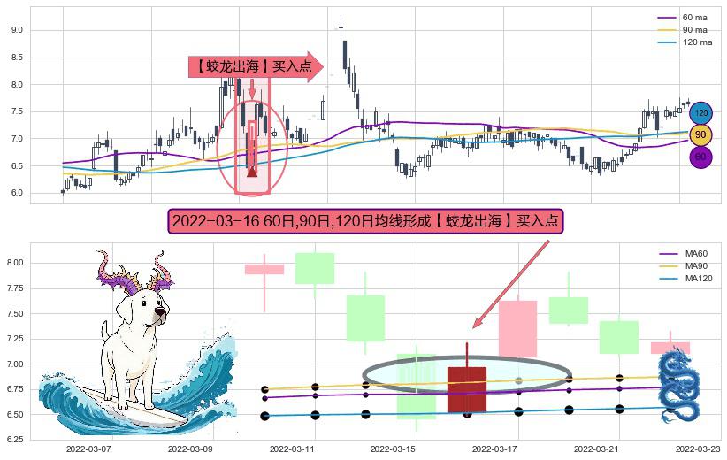 ⚀ 2022-03-16日显现 60日-90日-120日均线 【蛟龙出海】买入点 看多信号,后市看涨,买入