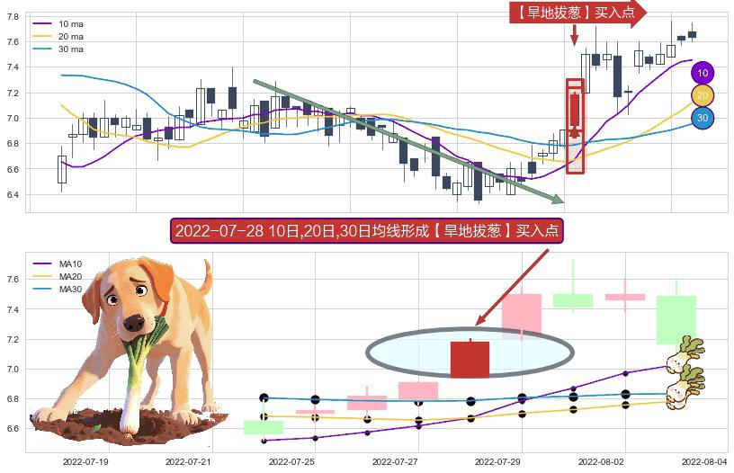 ⚀ 2022-07-28日显现 10日-20日-30日均线 【旱地拔葱】买入点 看多信号,后市看涨,买入