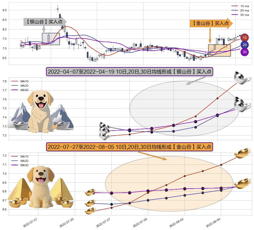 ⚃ 2022-07-28-日至2022-08-05-日显现 10日-20日-30日均线 【金山谷】买入点 其再次确认了买入信号,可靠性更强,买入