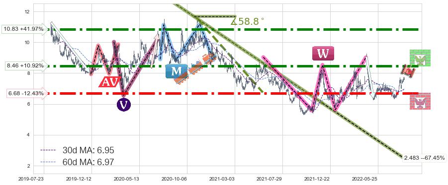 ♘ 支撑价格位6.68,可信任强度88.94%,距离最后交易2022-08-12形成的收盘价格7.63相差 -12.43%