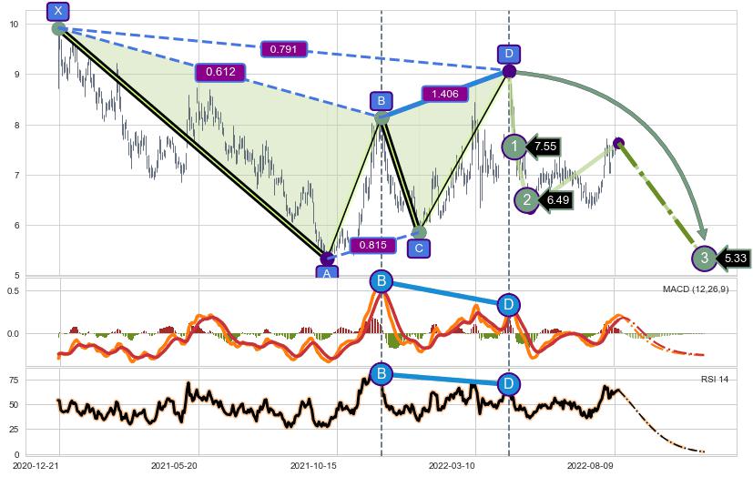 ➢ 谐波价格D点比B点高 ⤴,【MACD】指标D点比B点低 ⤵️