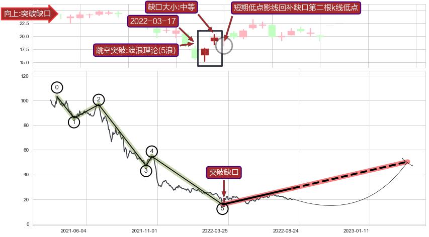 ➣ 突破缺口形成后,后续k已经超过14根,跳空突破波浪理论(5浪)关键点后, 出现【轻微回踩】迹象,短期低点影线回补缺口第二根k线低点