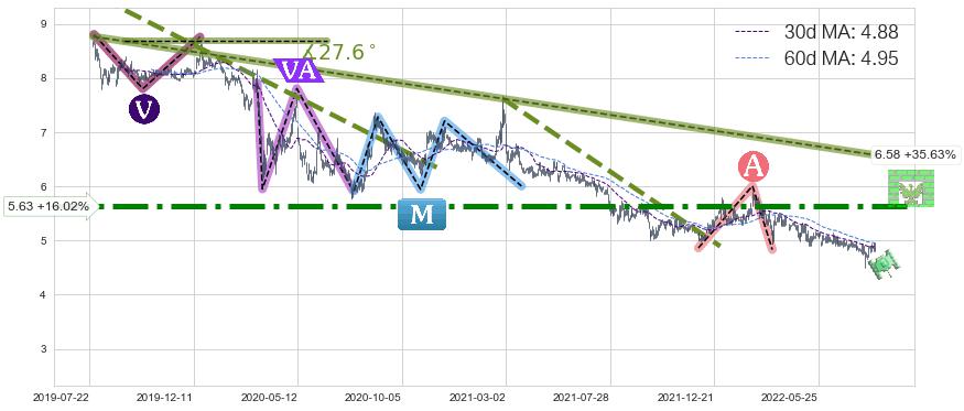♘ 在最后的下跌阶段2019-07-25至2022-08-12,存在 持续未破位的阻力位 ,阻力价格6.58,可信任强度88.68%,其距离最后价格4.85相差 +35.63%