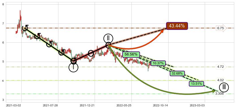 ➢ 循环浪继续向下【最低】位置(2023-05-15, 3.308),匹配聚类样本比例23.88%, 可能性概率13.51%