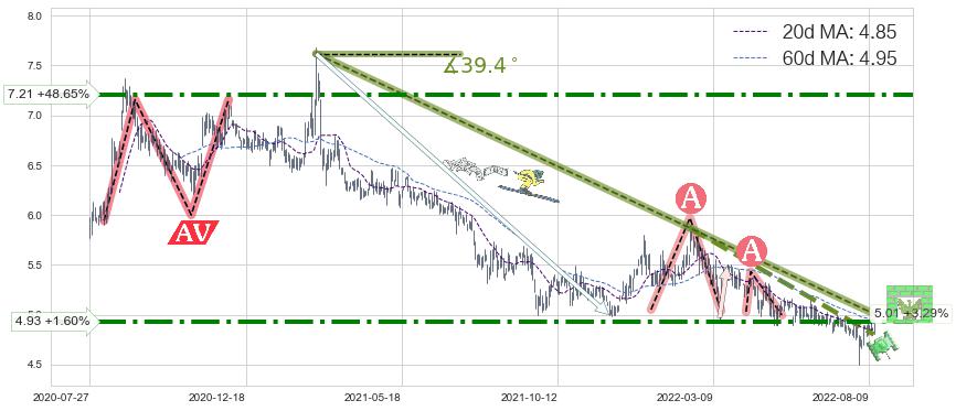 ♘ 阻力价格位7.21,可信任强度73.03%,距离最后交易2022-08-12形成的收盘价格4.85相差 +48.65%