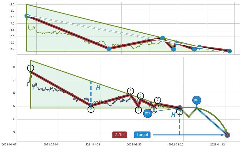 ➣ 【未确认突破,预测即将形成突破】下降三角形整理起点:2021-02-25, 预测突破点:2022-08-12,形态共359交易日