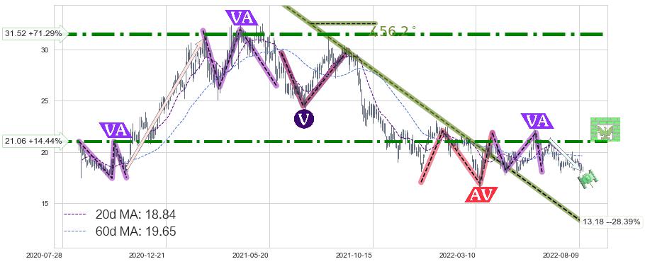 ♘ 阻力价格位21.06,可信任强度76.27%,距离最后交易2022-08-12形成的收盘价格18.40相差 +14.44%