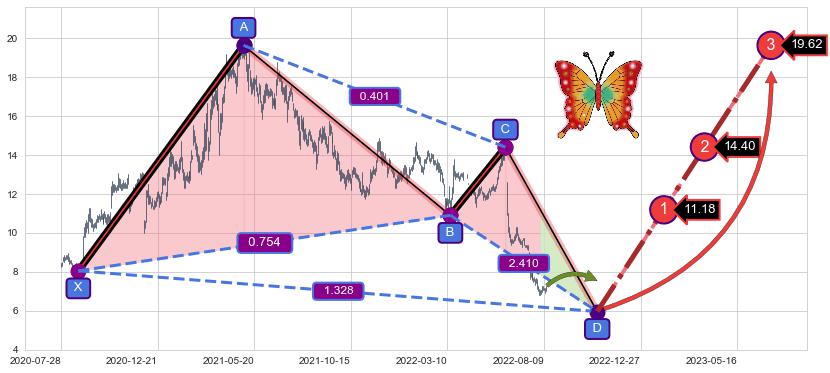 ➣ 未完成【蝴蝶】形态起点X: 2020-08-21, 已到达C点: 2022-06-13, 预测最终D点: 2022-10-25, 共531交易日