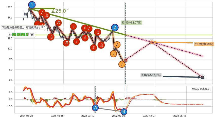 从2021-05-04至2022-08-12,共包含315个交易日,阶段股价下跌-86.48%,阶段股价变动位移路程比: 1 : 7,下跌趋势角度: 26.0