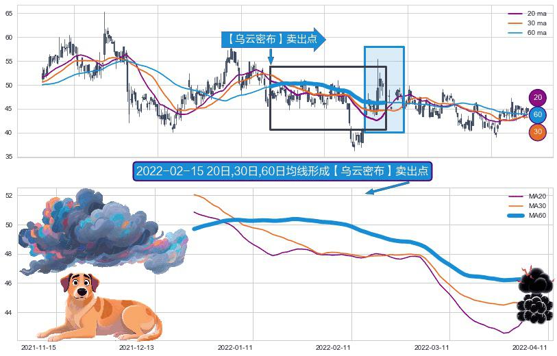 ⚀ 2021-12-23日-2022-04-04日显现 20日-30日-60日均线 【乌云密布】卖出点 看空信号,后市看跌,卖出