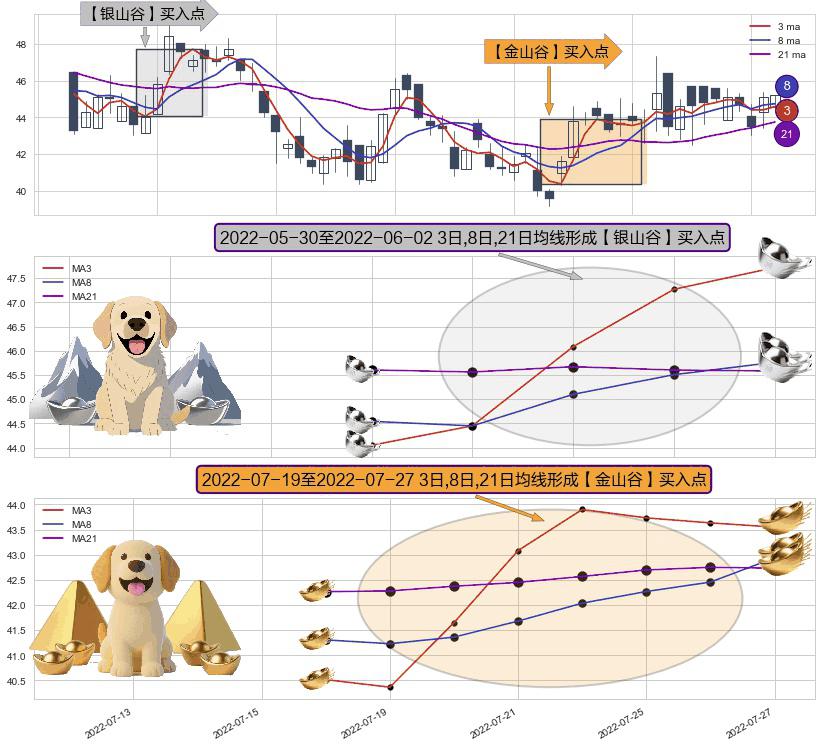 ⚃ 2022-07-20-日至2022-07-27-日显现 3日-8日-21日均线 【金山谷】买入点 其再次确认了买入信号,可靠性更强,买入