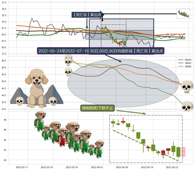 | 3 🅚:下跌两颗星 | 下跌三颗星 ➕ 🎢:【死亡谷】卖出点均线组合卖出点信号形成后,猜想后续破位下跌,沿着向下的尖头三角下跌 ☞ 看空信号 ⇥ 【均线】交织【🅚线】⇥ 综合量化分数: 43 | > |