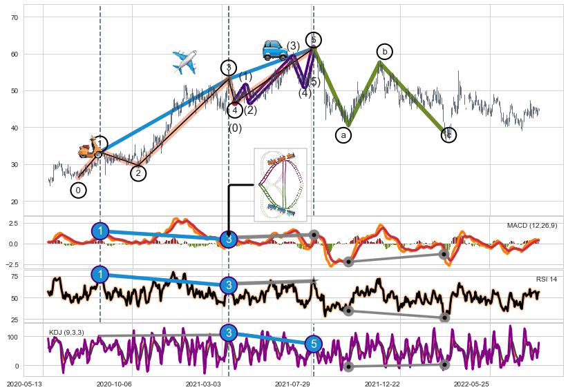 ➢ 1,3,5驱动浪MACD, RSI, KDJ走势都出现【常规背离】反转信号增强