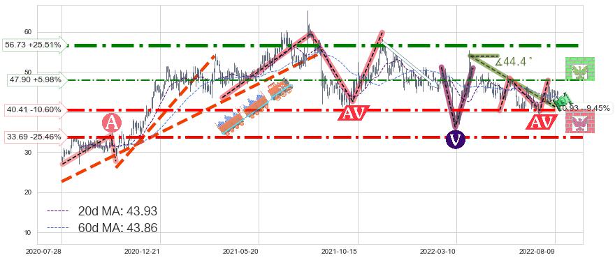 ♘ 阻力价格位47.90,可信任强度47.63%,距离最后交易2022-08-12形成的收盘价格45.20相差 +5.98%