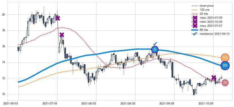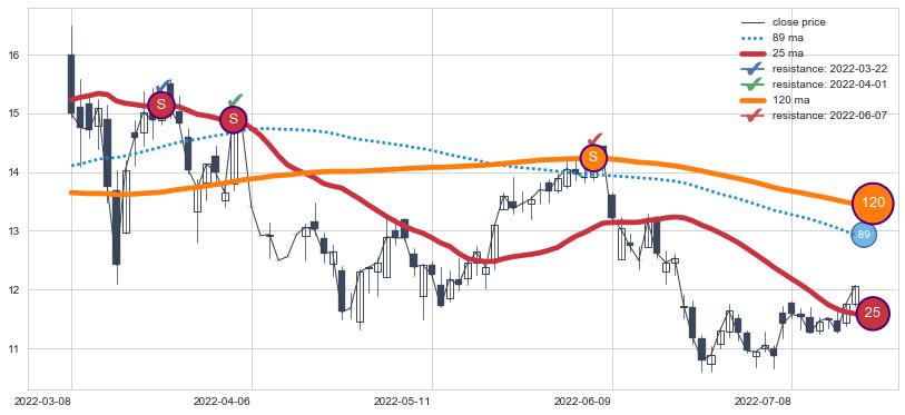 下跌趋势2022-03-08-2022-07-19,均线120, 25确认关键阻力3处