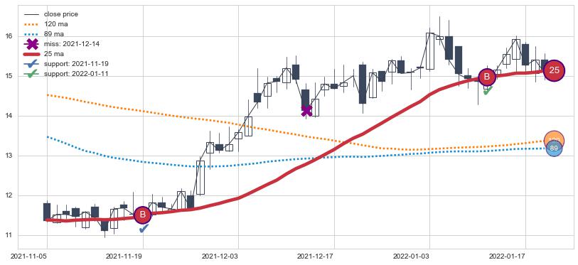 上涨趋势2021-11-05-2022-01-19,均线25确认关键支撑2处