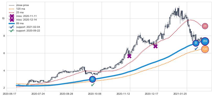 上涨趋势2020-06-17-2021-02-11,均线89确认关键支撑2处
