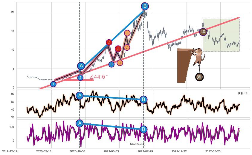 从2020-03-23至2021-07-26,共包含331个交易日,阶段股价上涨221.63%,阶段股价变动位移路程比: 1 : 5,上涨趋势角度: 44.6