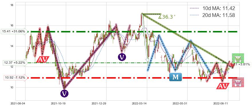 ♘ 阻力价格位12.37,可信任强度47.71%,距离最后交易2022-08-12形成的收盘价格11.76相差 +5.22%