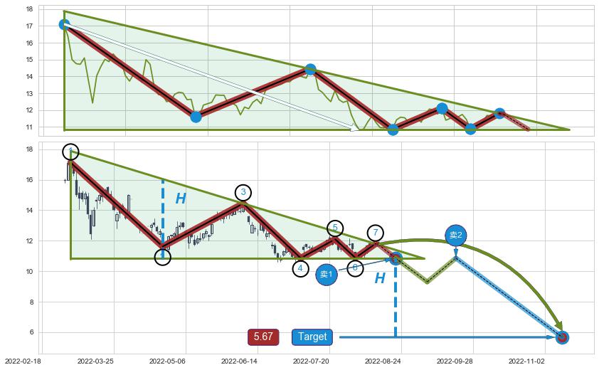 ➣ 【未确认突破,预测即将形成突破】下降三角形整理起点:2022-03-04, 预测突破点:2022-08-22,形态共114交易日