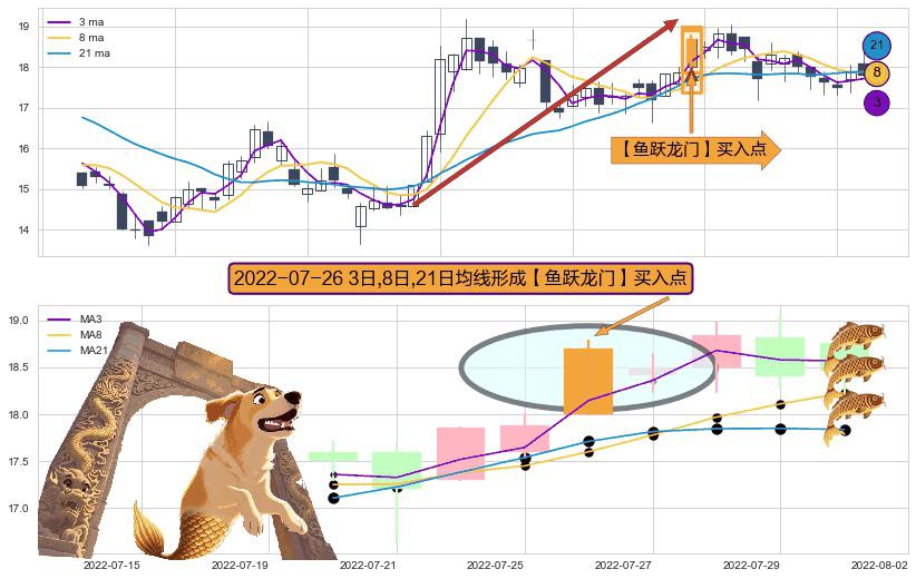 ⚀ 2022-07-26日显现 3日-8日-21日均线 【鱼跃龙门】买入点 看多信号,后市看涨,买入