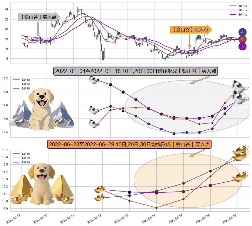 ⚂ 2022-06-24-日至2022-06-29-日显现 10日-20日-30日均线 【金山谷】买入点 其再次确认了买入信号,可靠性更强,买入