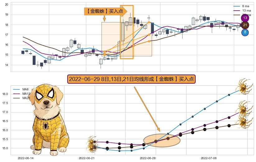 ⚀ 2022-06-29日显现 8日-13日-21日均线 【金蜘蛛】买入点 看多信号,后市看涨,买入