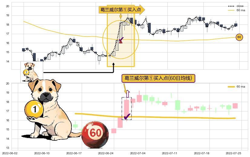 ⚀ 2022-06-28-日显现 葛兰威尔均线 60日均线 第买①入点 走势反转见底信号,后市看涨,买进信号